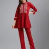 Green chinon top with floral and thread embroidery. Comes with pant.