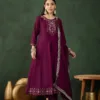 Embrace timeless elegance with this beautiful Olive Vichitra Silk Kurta set. The floral embroidery and handwork on the yoke give the Anarkali-style kurta a stunning look. With 3/4th embroidered sleeves and a flowy hemline, it’s perfect for special occasions. The set includes a comfortable, solid Olive trouser with an elastic waistband and a handy side pocket for convenience. The look is completed with a matching Olive dupatta, featuring Swaroski detailing and a pretty Jacquard lace border. The soft crepe inner fabric ensures comfort all day long, making this outfit ideal for festivals, weddings, or family gatherings.