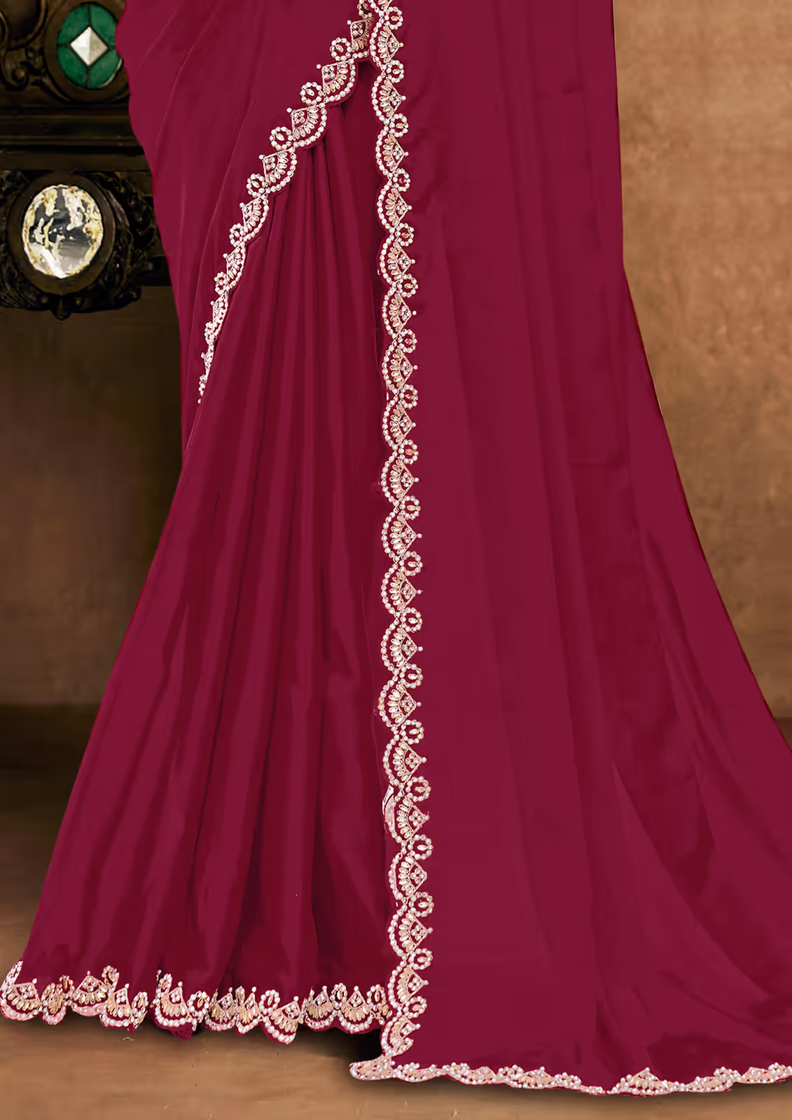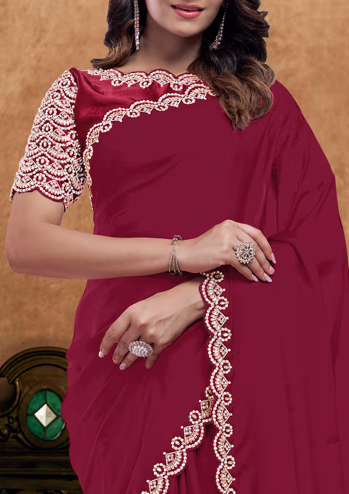 The Norita 44516 Red Crepe Silk Saree is designed for festive and traditional occasions, offering a combination of smooth fabric and simple handwork. Made from pure crepe silk, the saree provides a soft and comfortable drape.
