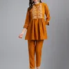 Mustard chinon top with floral and thread embroidery. Comes with pant.