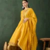 Embrace timeless elegance with this beautiful Red Vichitra Silk Kurta set. The floral embroidery and handwork on the yoke give the Anarkali-style kurta a stunning look. With 3/4th embroidered sleeves and a flowy hemline, it’s perfect for special occasions. The set includes a comfortable, solid Red trouser with an elastic waistband and a handy side pocket for convenience. The look is completed with a matching Red dupatta, featuring Swaroski detailing and a pretty Jacquard lace border. The soft crepe inner fabric ensures comfort all day long, making this outfit ideal for festivals, weddings, or family gatherings.